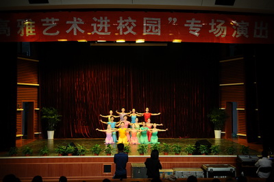 10月15日晚,学校举行庆祝奉贤校区落成暨合校十周年“高雅艺术进校园”歌舞专场演出,特邀由著名舞蹈家黄豆豆任艺术总监的上海歌舞团&上海青春歌舞团来校献艺。尽管这天是周末,但学生活动中心多功能厅内仍座无虚席,艺术家们丰富多彩的高水平演出赢得全场观众数十次热情的掌声。