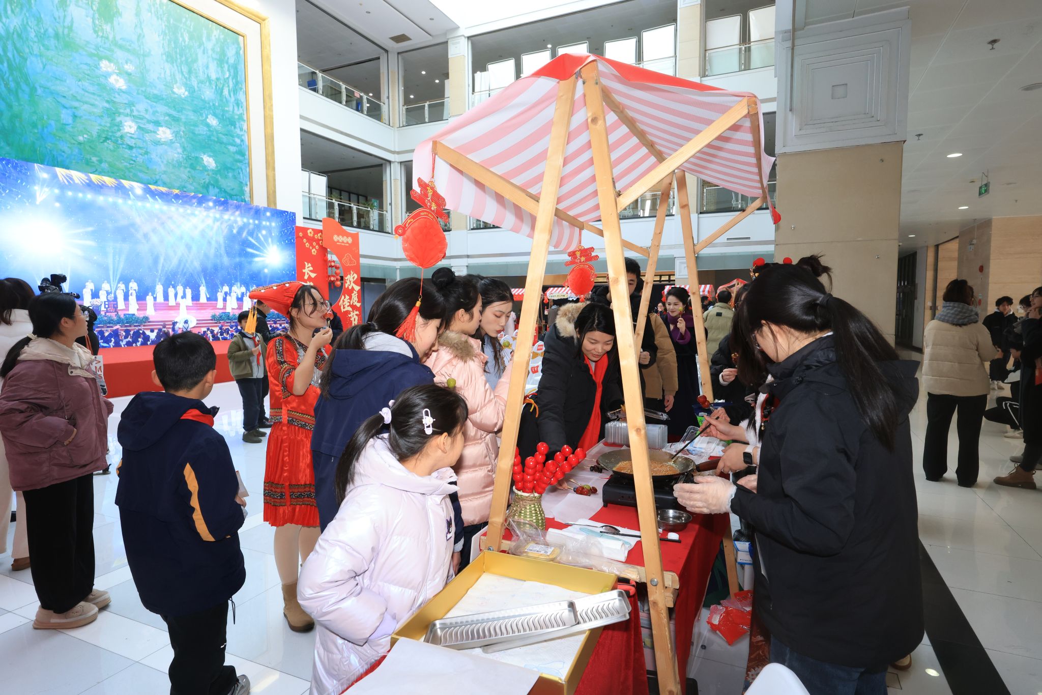 “年画印刷体验”让同学们体验古老印刷术的神奇,感受传统文化的博大精深。而在“冰糖‘福禄’”摊位,一颗颗晶莹剔透的冰糖葫芦,不仅为大家带来了甜蜜的滋味,更承载着浓浓的节日氛围。